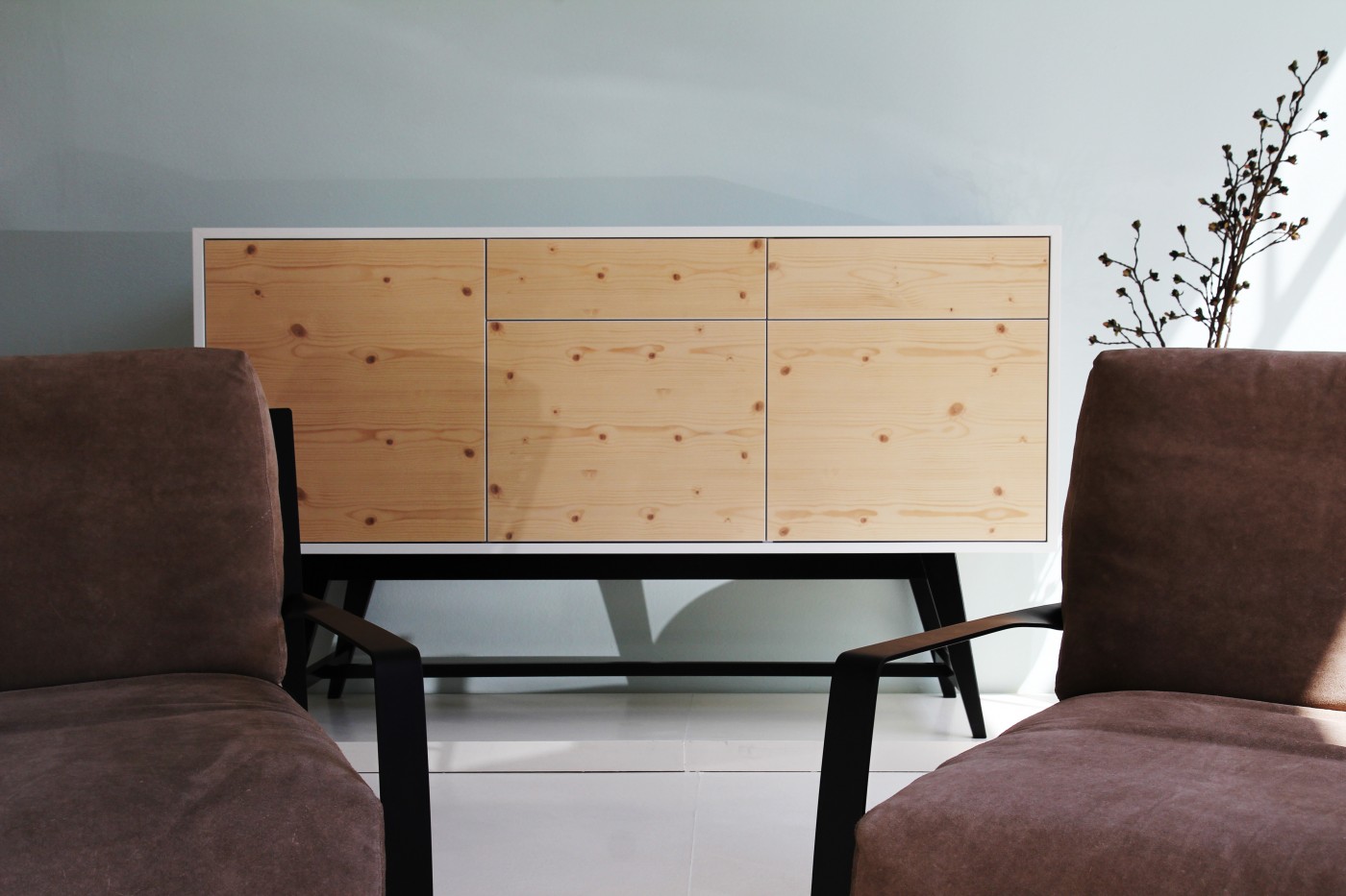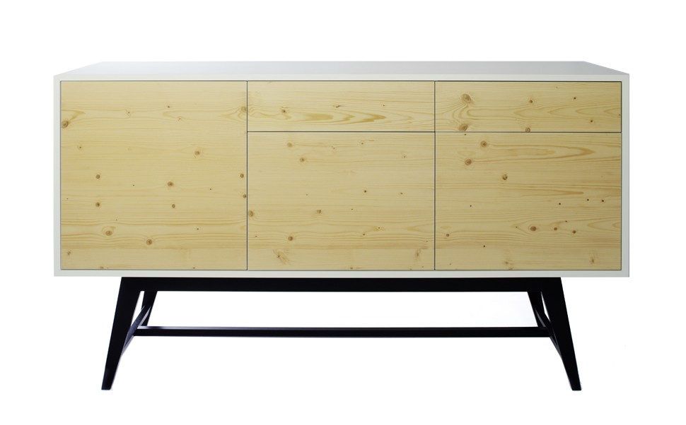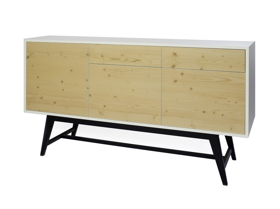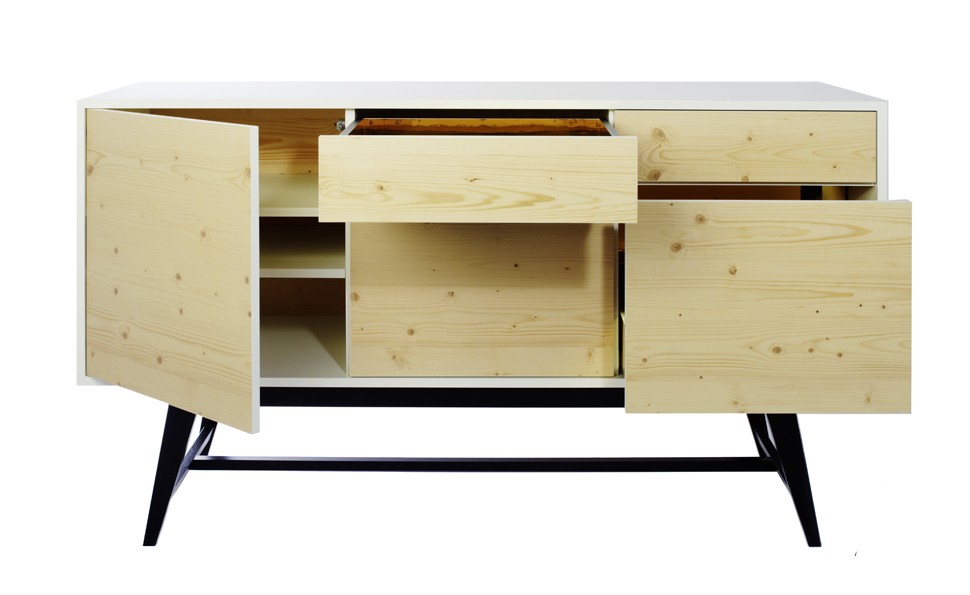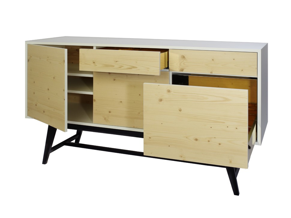 Inspired by the 50's, the first feature that grabs ones attention is the top surface of the unit. On closer inspection the configuration of the interior also reveals its surprises with storage space for dishes and glasses. A noble as well as a practical designer piece of furniture for the dining room or lounge. The front and back are made of natural wood with the edges painted white. The exterior is white with a satin finish. The inside of the drawer and pull-out bottle rack are resin coated.