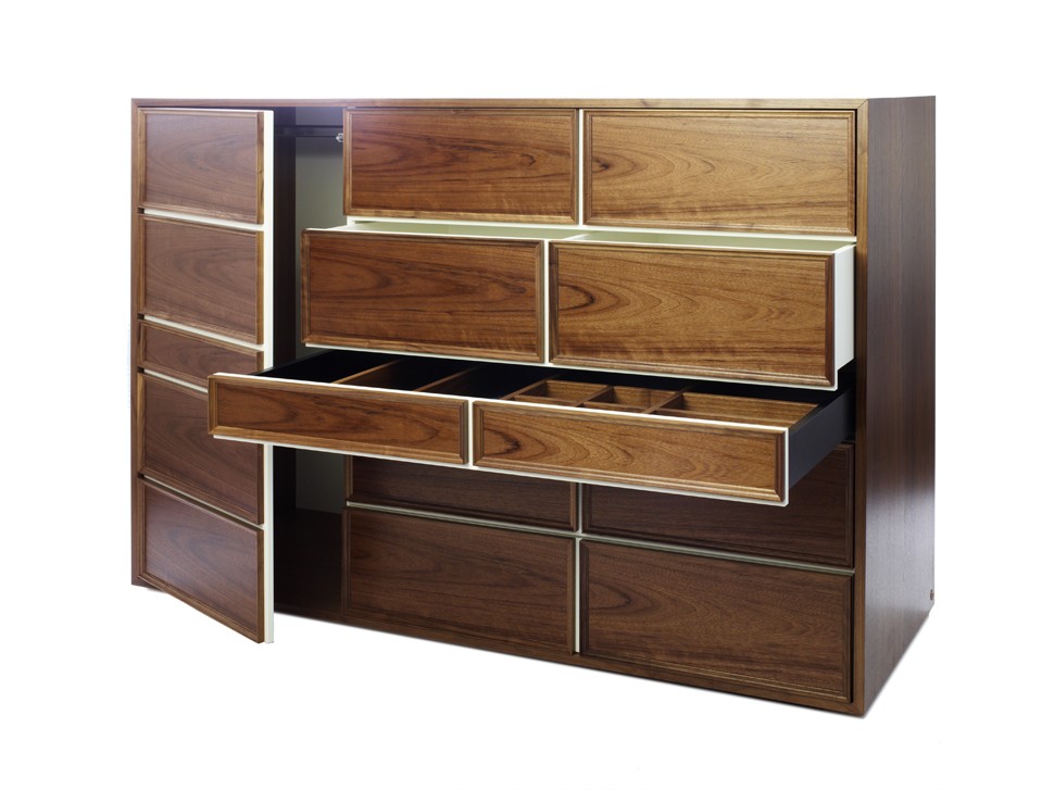 Through the medium height of the wardrobe this piece offers generous storage coupled with a large top surface for decorative objects. Shirts and suits can be hung properly, but also folded items of clothing find their place in the drawers of the unit. The black middle-drawer has been specifically designed for dressing accessories. The entire exterior of the cabinet is veneered with ovangkol and the inside surfaces coated white.