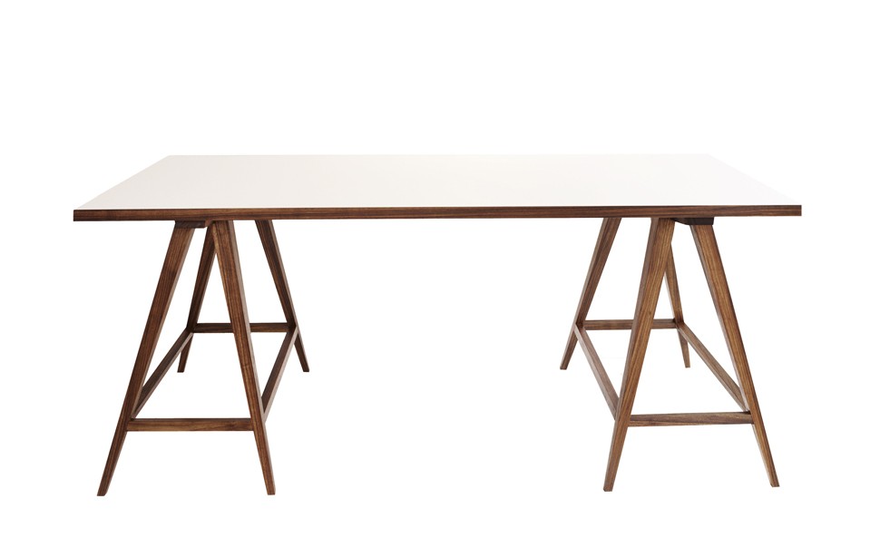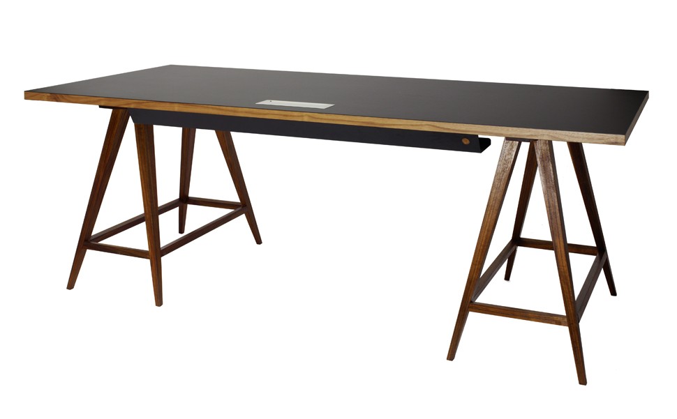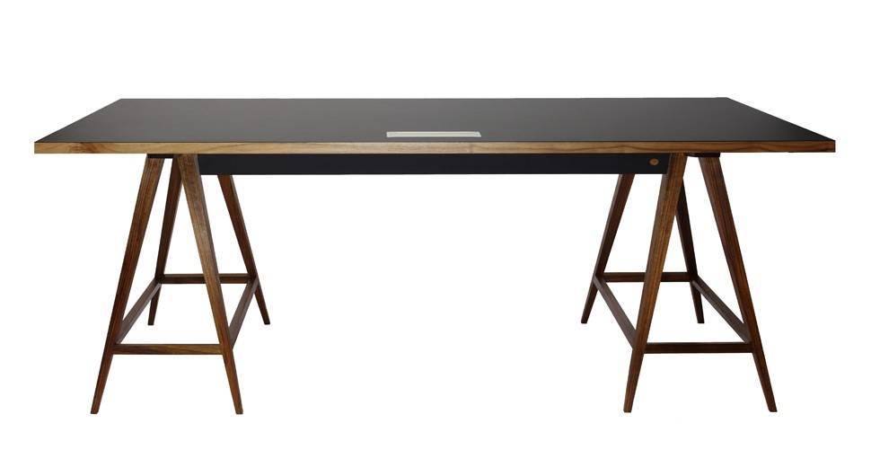 Especially the design of the office table’s trestles gives the unit an appearance of a workbench on which ideas can be created, drafted, even invented and realized. It’s a place for inspiration, where the creative thinking process is encouraged and nurtured. The office table is available in two versions with the Premium version having the additional feature for easily running and stowing cables, thanks to the provision of a cable channel. The working surface is covered with black Desktop the edges of which are from walnut. The trestles are made of solid walnut. The larger version additionally has a milled cableway and a black metal conduit.