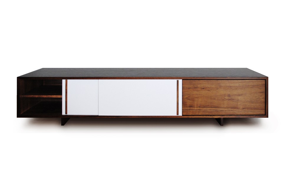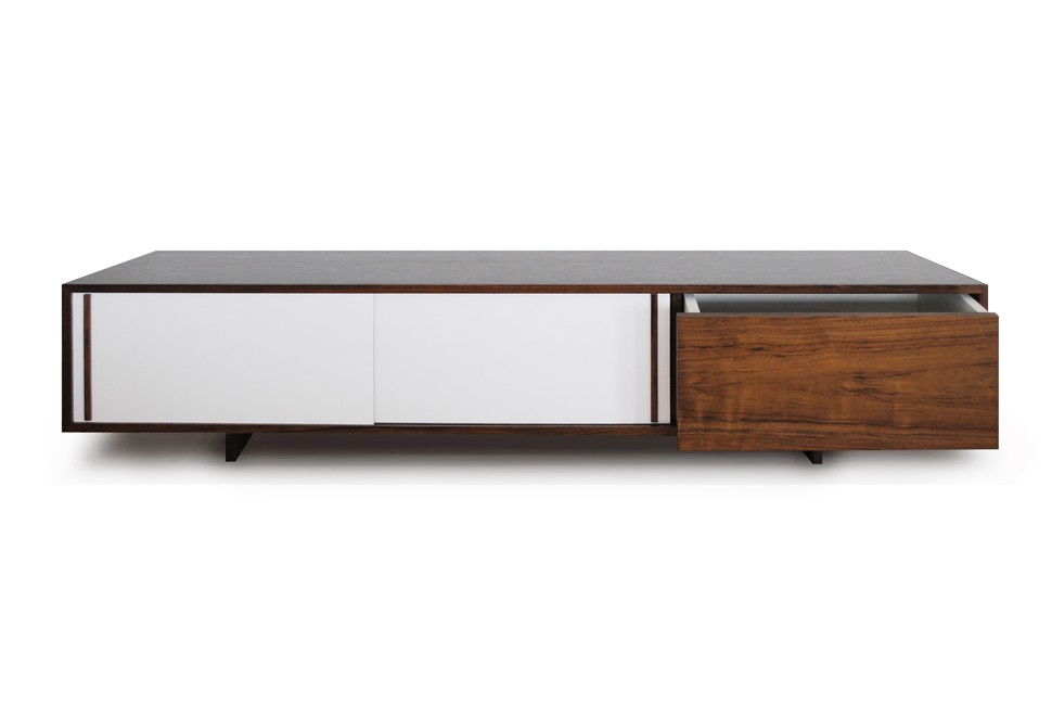 With its sliding doors and drawer this TV Board is reminiscent of the classics of the 50s. Today, however, the TV provider control box, the DVD player and DVD collection, the Wii and Playstation need also to be stowed away inside the unit. Here, the hidden cable outlet ensures order and tidiness. The body is veneered both inside and outside with ovangkol. The double drawer is made from solid walnut, the inside thereof is coated in white.